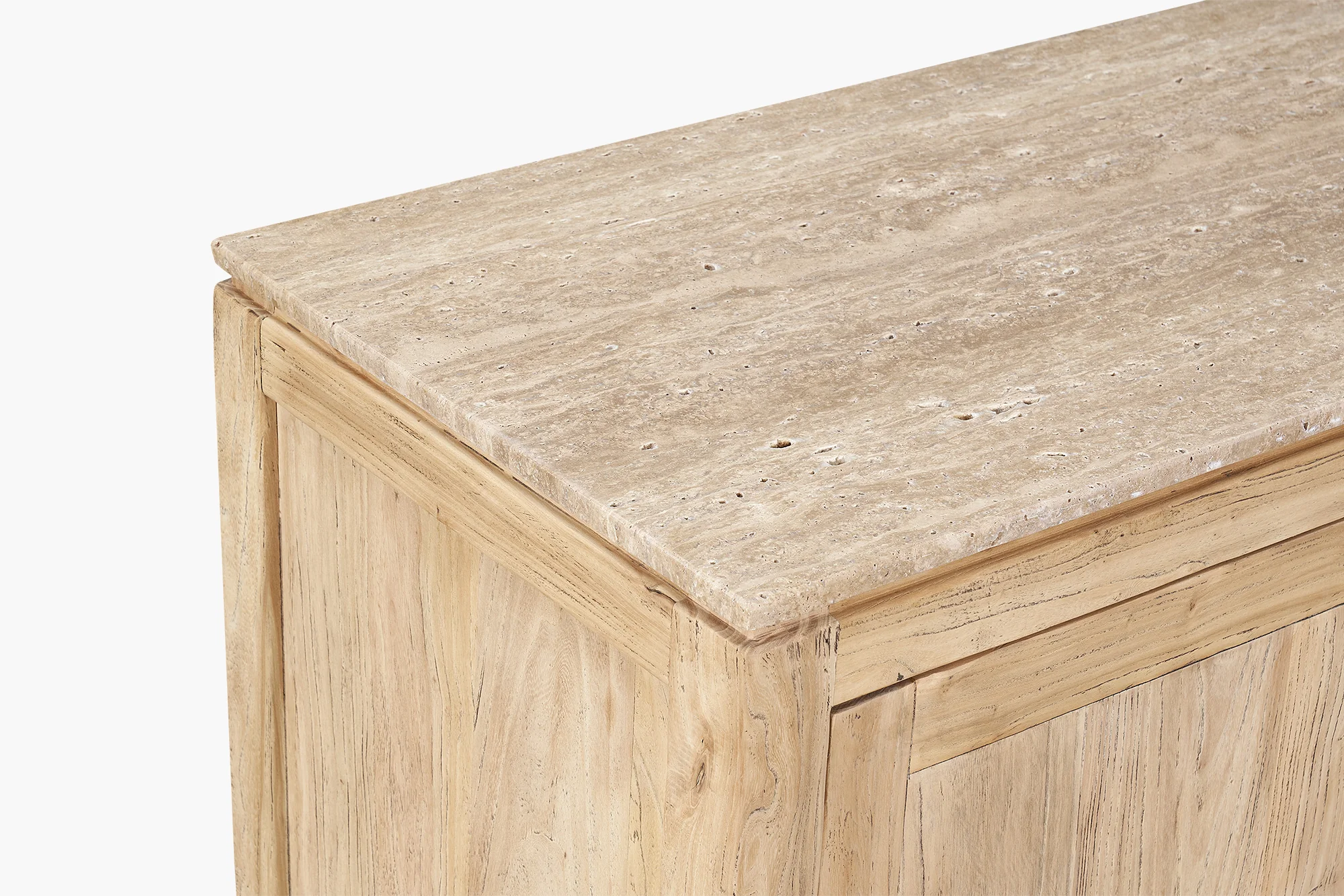 The Axol Buffet, made from natural travertine stone and old elm timber, effortlessly represents the signature MCM House aesthetic of rugged elegance, travertine is super versatile in finish and texture. Across our range we have various textures from polished and smooth to matte or honed finishes. The flexibility of this stone lends itself to different unique designs.