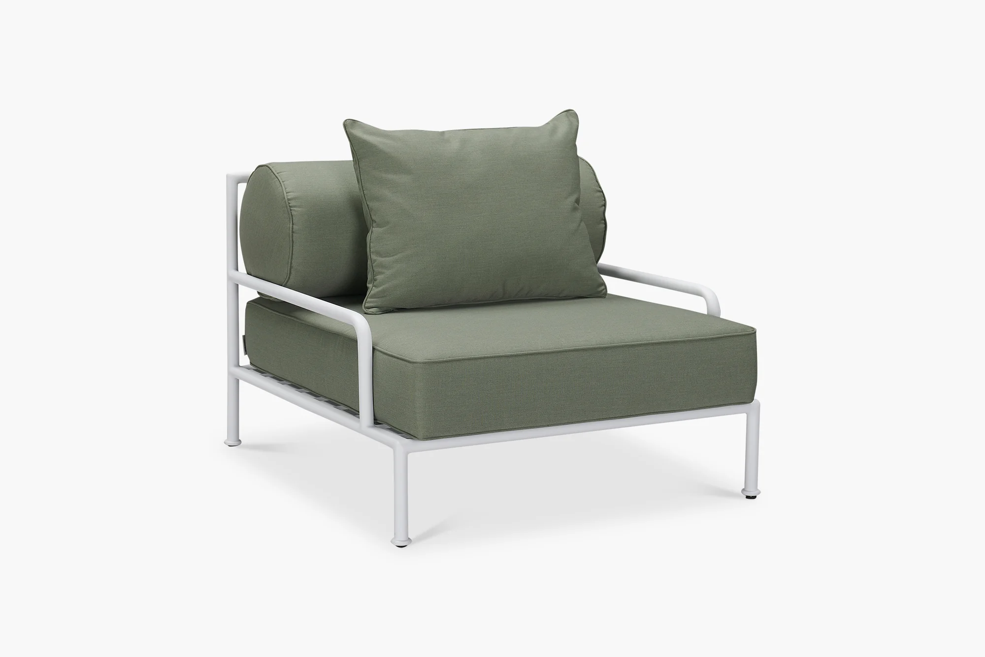 The Outdoor Rowe Lounge Chair has been inspired by a minimalist and contemporary aesthetic. Aluminium framing in a boxy, low profile has been offset with a soft round bolster cushion for back support. These contrasting colours, fabrics and shapes make for a striking combination in any outdoor setting. For lasting outdoor use, this lounge chair features quick dry foam cushions and a UPF rating of 50+.