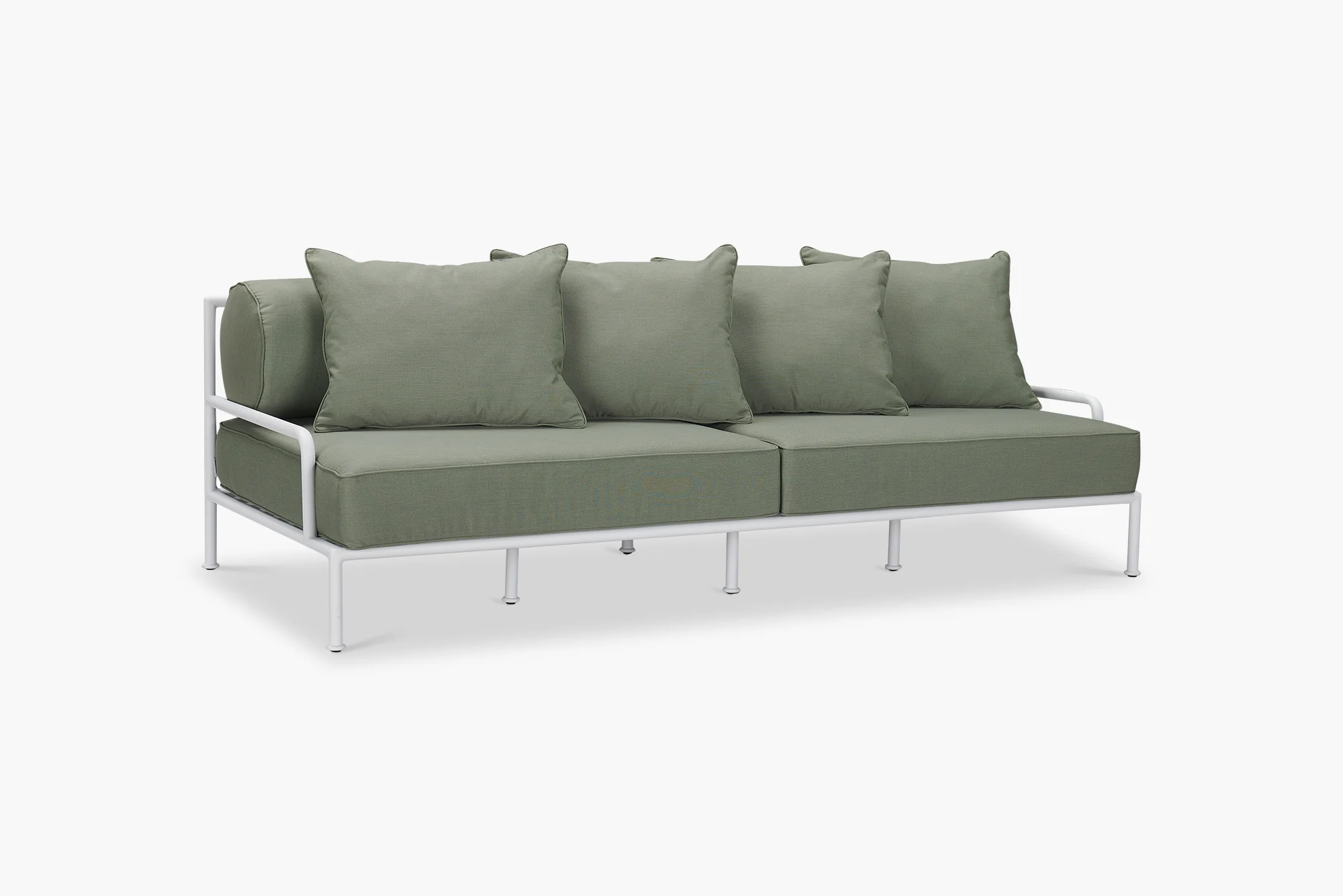 The Outdoor Rowe Sofa has been inspired by a minimalist and contemporary aesthetic. Aluminium framing has been offset with comfortable seat cushioning in a range of outdoor fabrics. The boxy, low profile has been offset with soft round bolster cushions for back support. These contrasting colours, fabrics and shapes make for a striking combination in any outdoor setting. For lasting outdoor use, this outdoor sofa features quick dry foam cushions and a UPF rating of 50+.